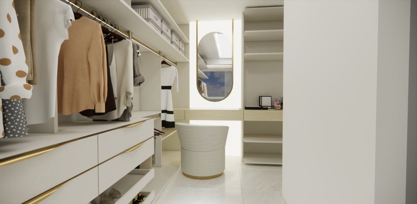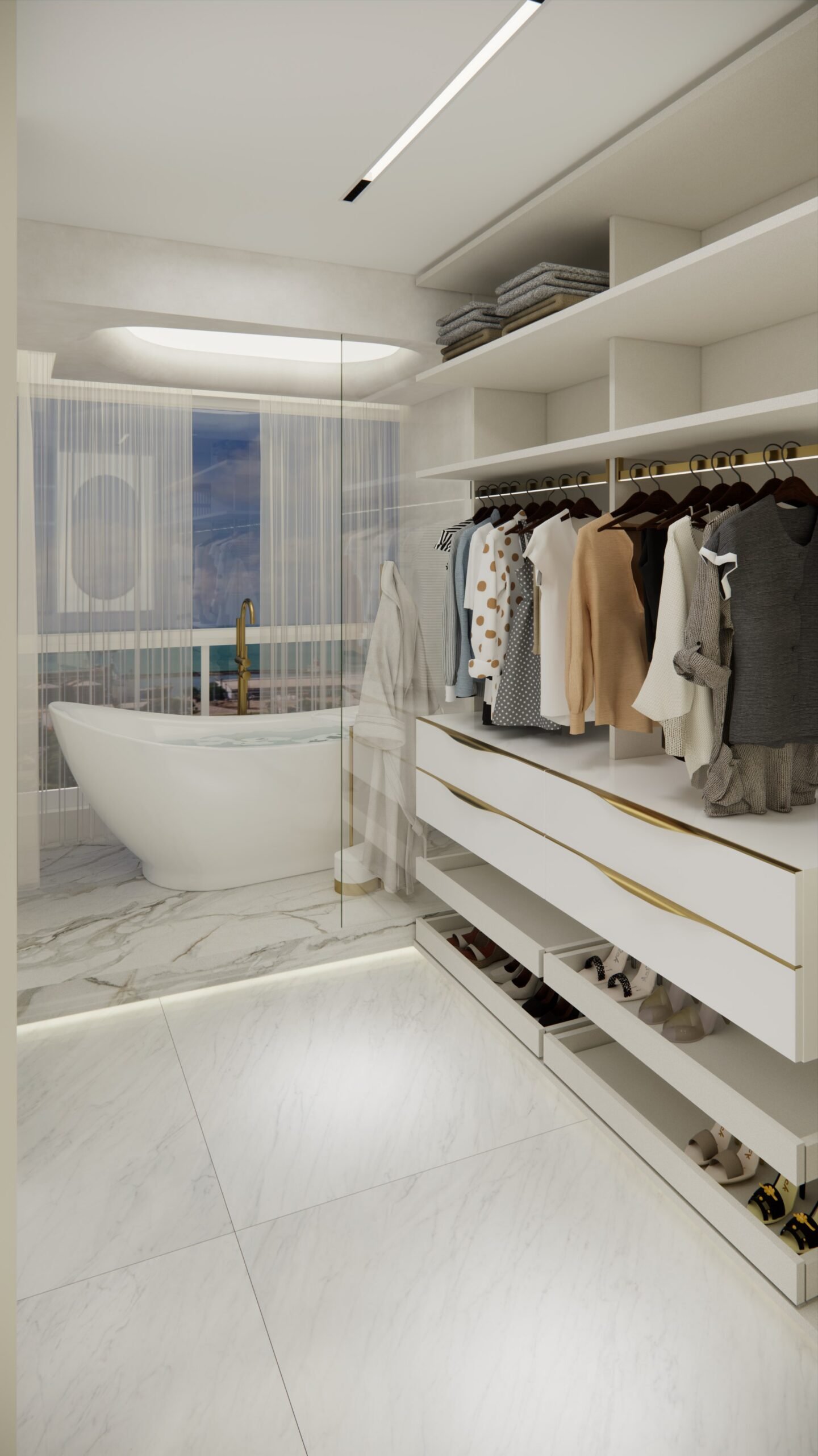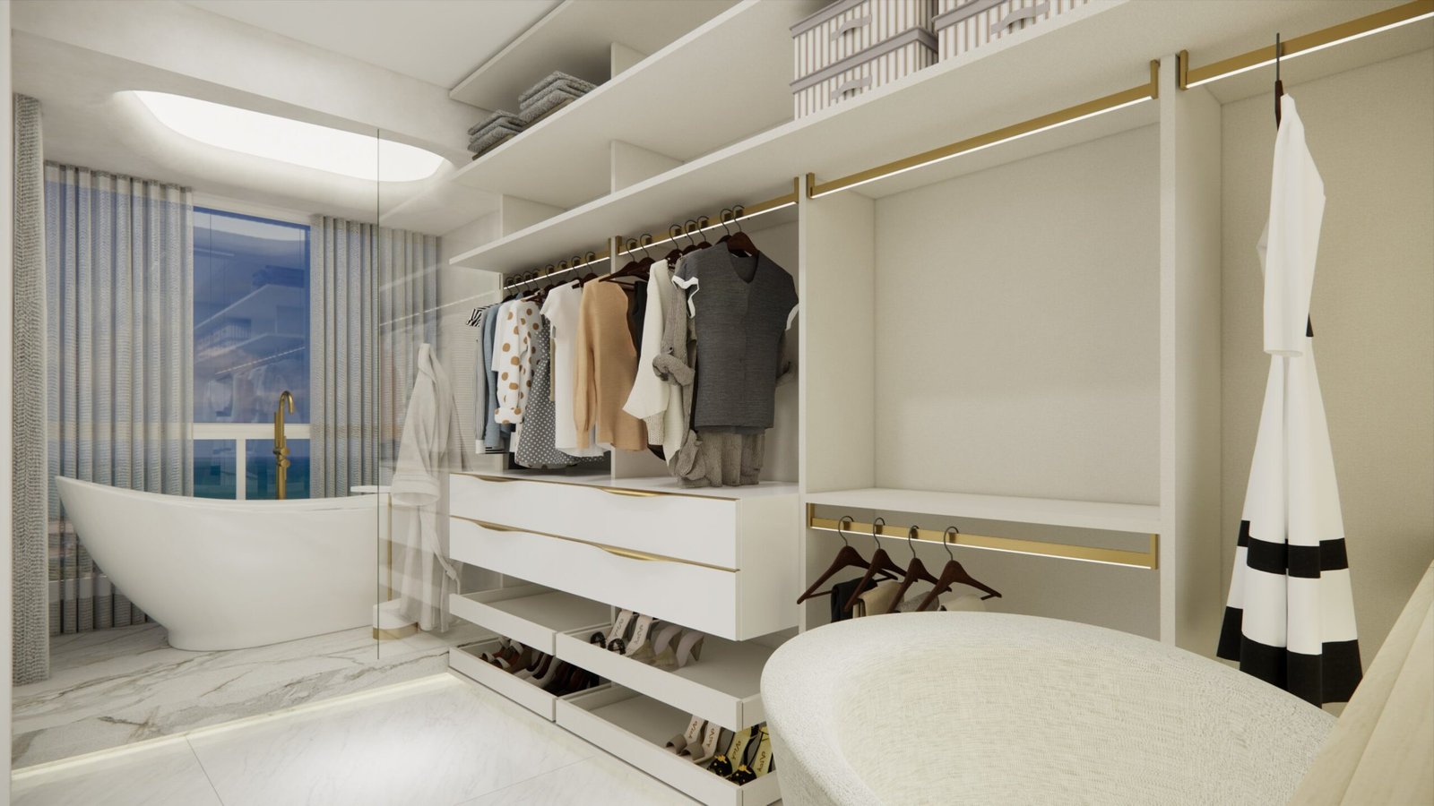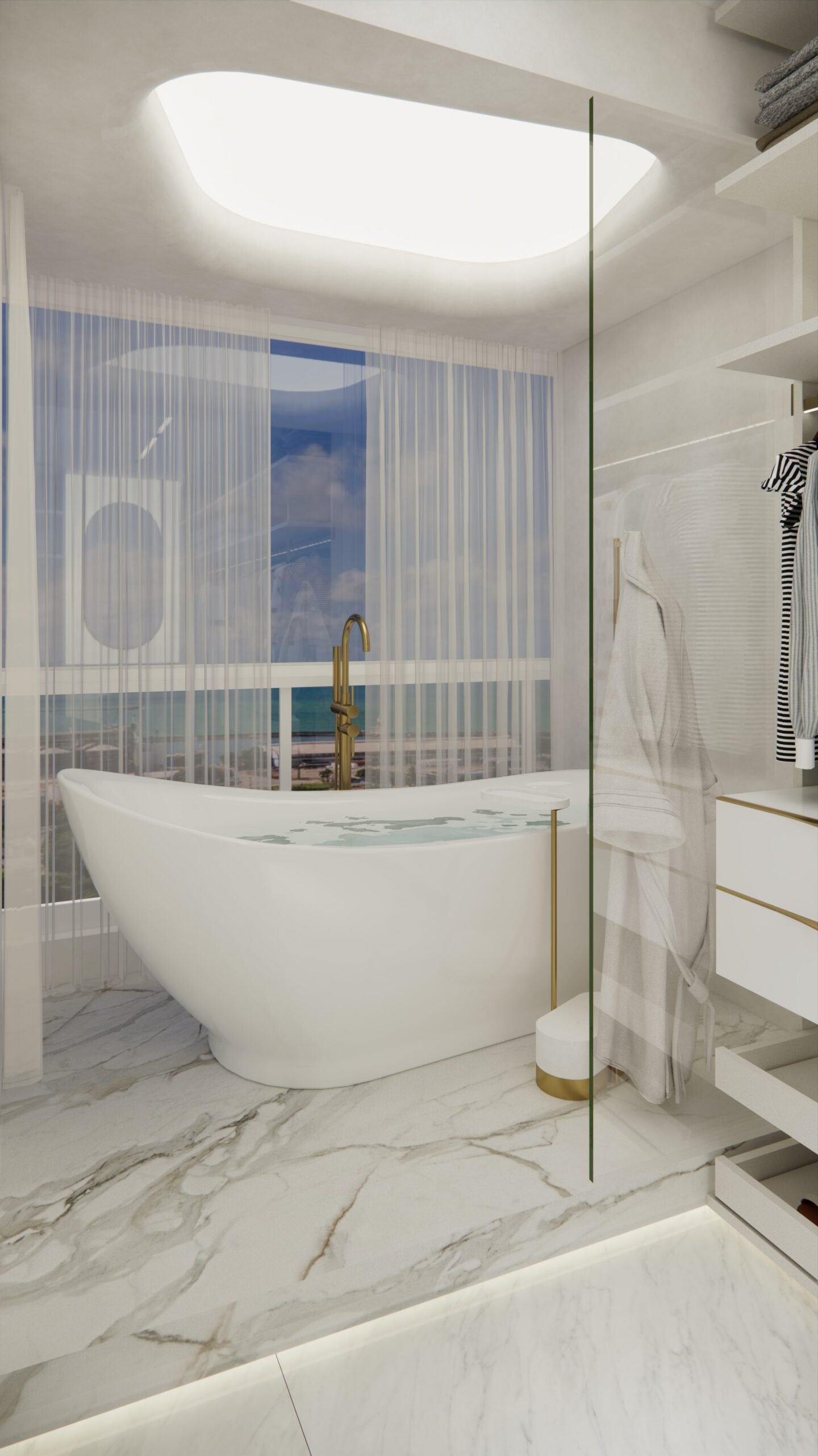 A suíte master, um dos destaques do projeto, inclui um elegante closet e uma banheira de imersão estrategicamente posicionada para aproveitar a vista panorâmica do Rio Capibaribe, criando uma experiência sensorial única de relaxamento e conexão com a natureza ao redor.