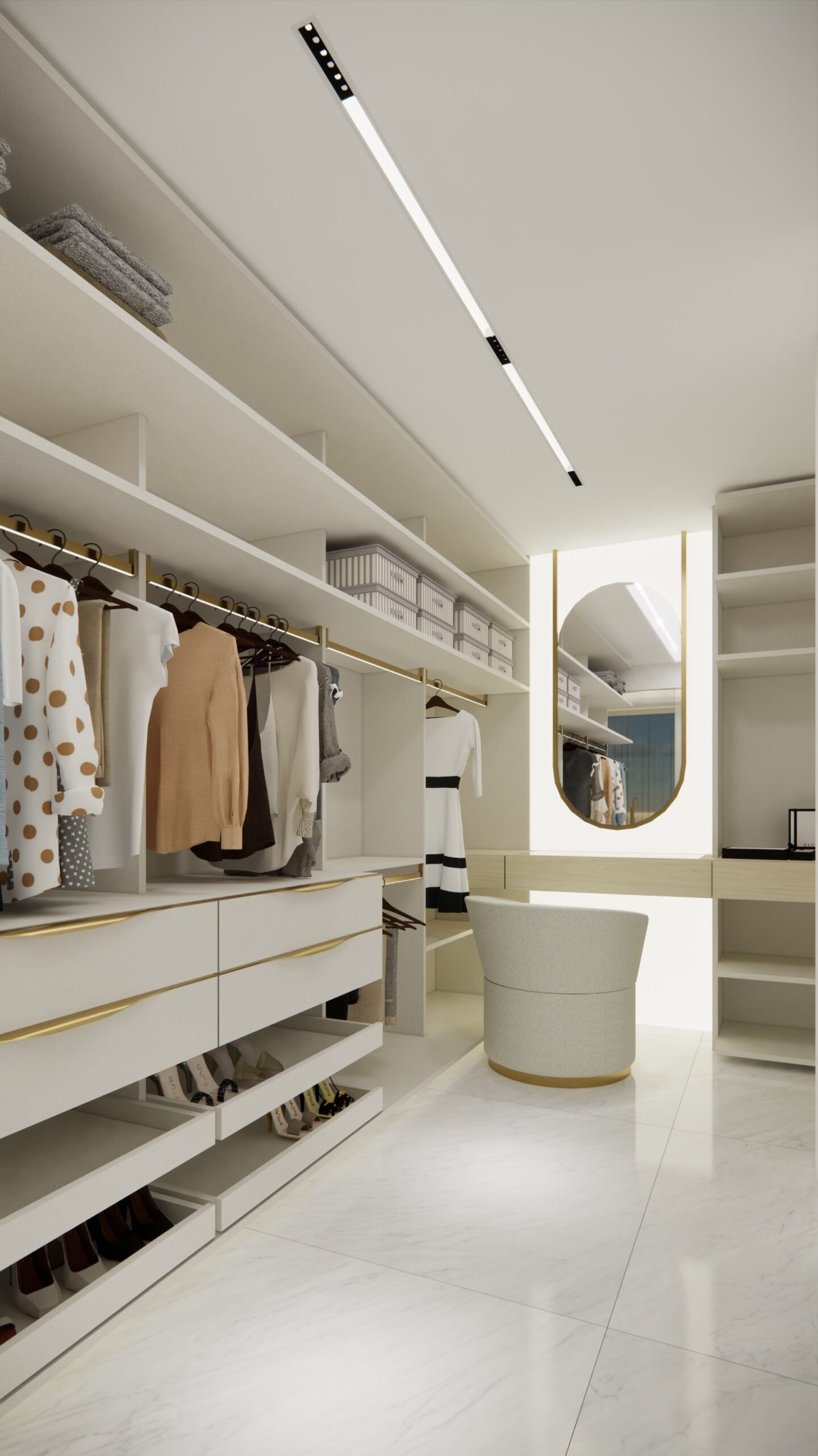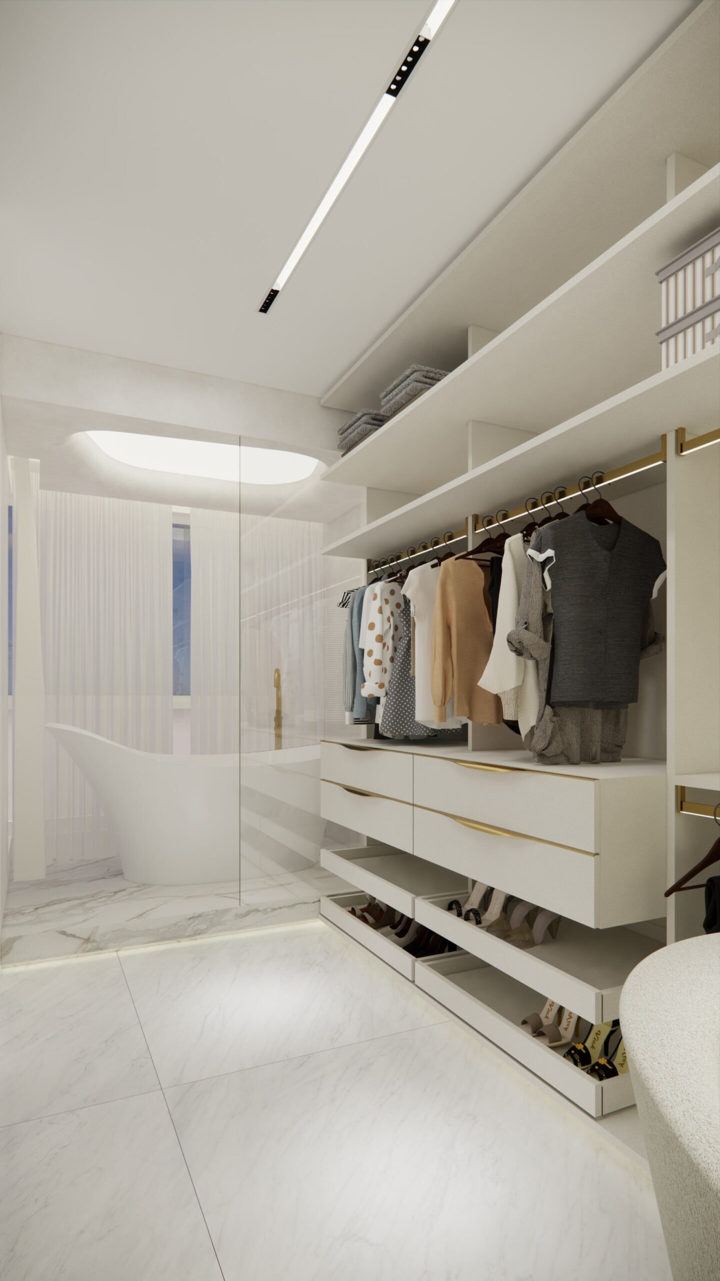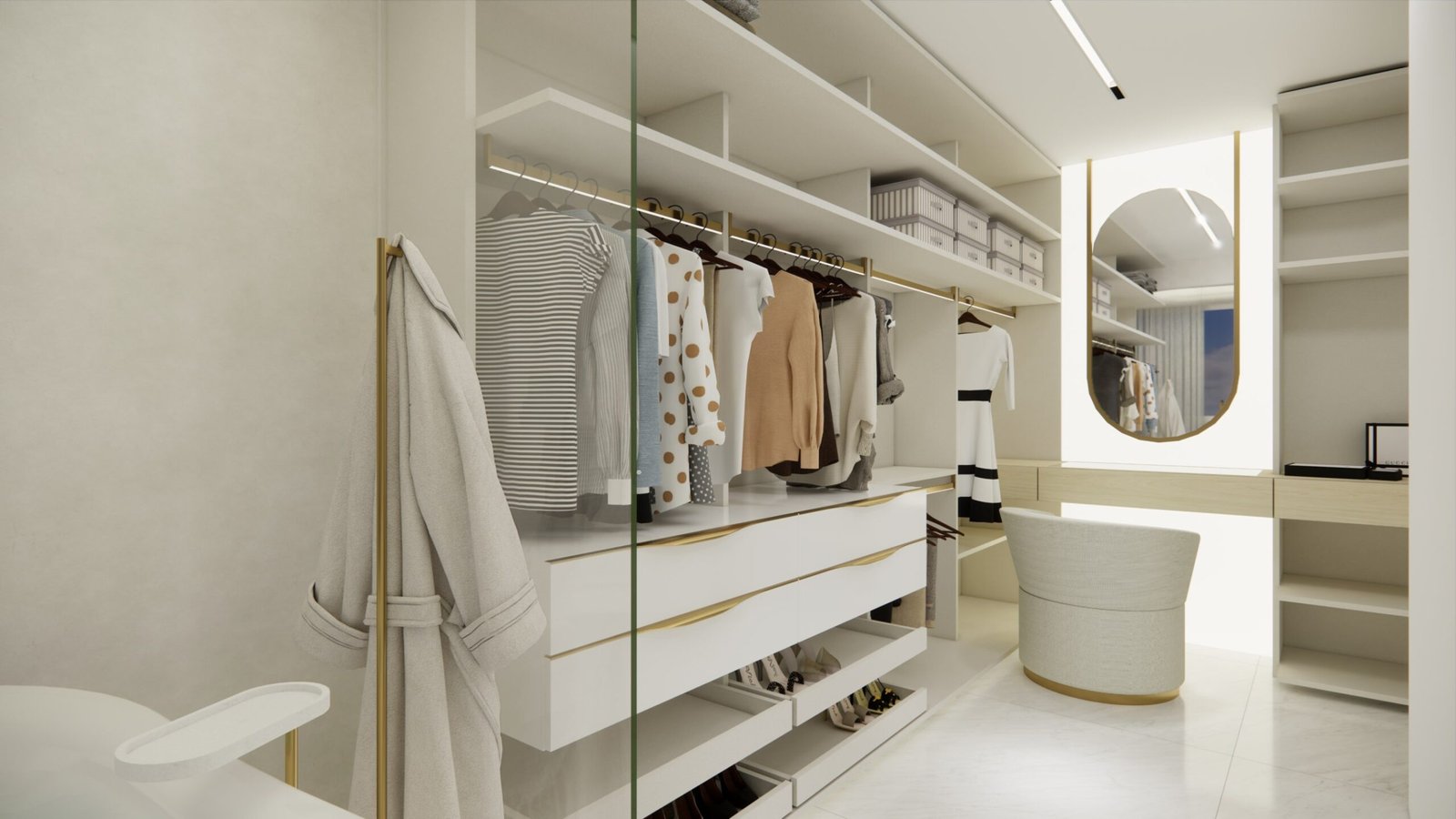 A suíte master, um dos destaques do projeto, inclui um elegante closet e uma banheira de imersão estrategicamente posicionada para aproveitar a vista panorâmica do Rio Capibaribe, criando uma experiência sensorial única de relaxamento e conexão com a natureza ao redor.