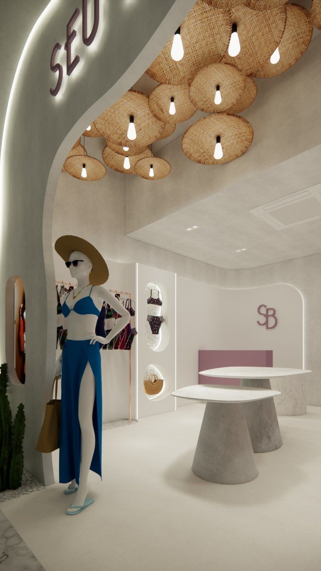 Inspirado na essência feminina e na fluidez das paisagens litorâneas, este projeto traduz os valores da moda praia em uma arquitetura que une sofisticação, rusticidade e minimalismo, sem perder a naturalidade e a leveza que definem a marca.